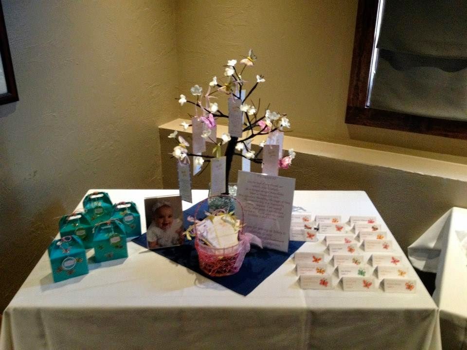 The boxes on the left were our favors for the under 5 crowd. Clearance boxes from Target decorated by M with butterfly stickers. We also added some butterflies to the tree.